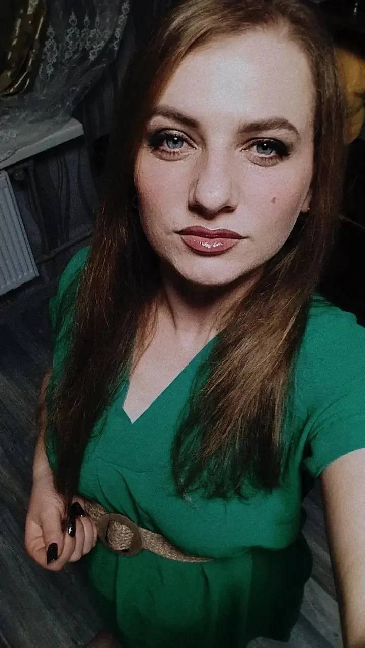 Welcome to my world, where warmth and confidence intertwine. With my soft, russet locks and bright blue eyes, I invite you to share a moment filled with laughter and connection. Let's explore the art of subtle seduction together.
